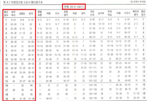 2. 각 소검사의 원점수와 변환된 환산점수가 제대로 잘 되었는지 확인한다 . 환산점수는 실시 및 채점 요강의 표 A.1 중 수검자의 생활연령에 해당되는 규준을 참조하여 찾는다 .